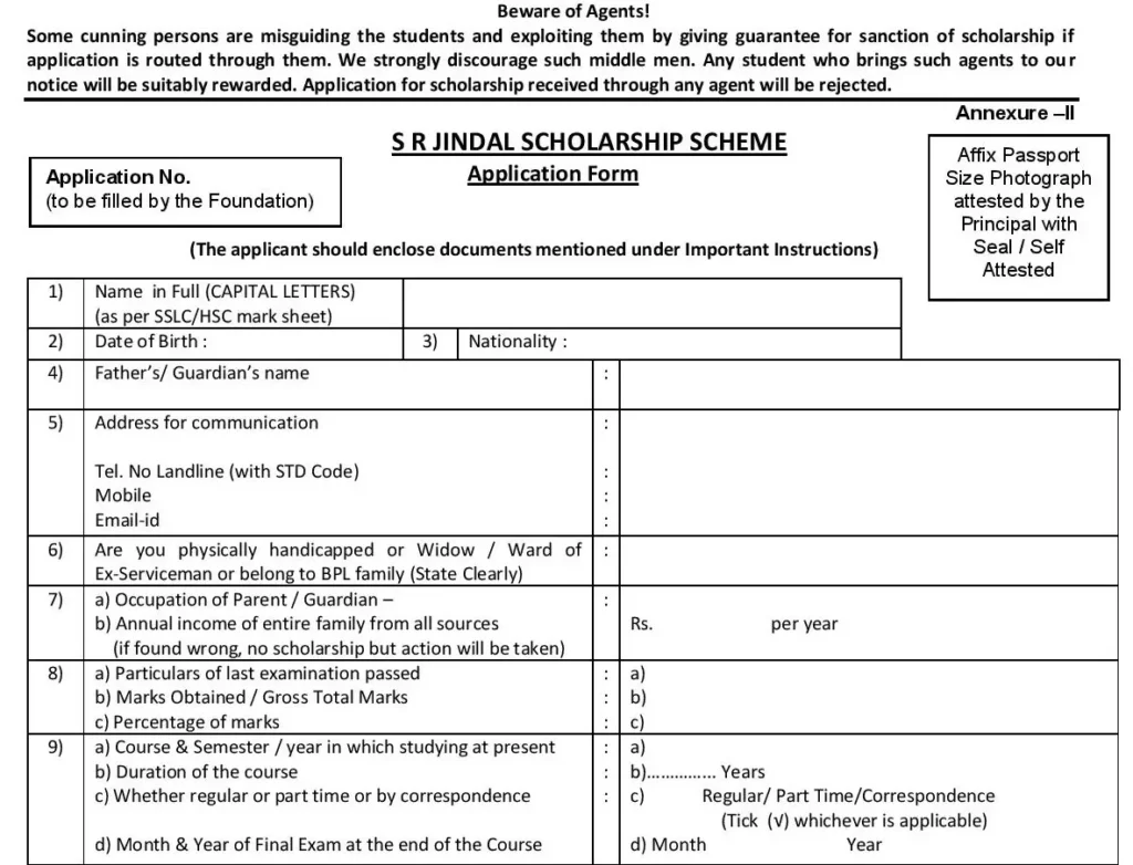 SR Jindal Scholarship required Documents